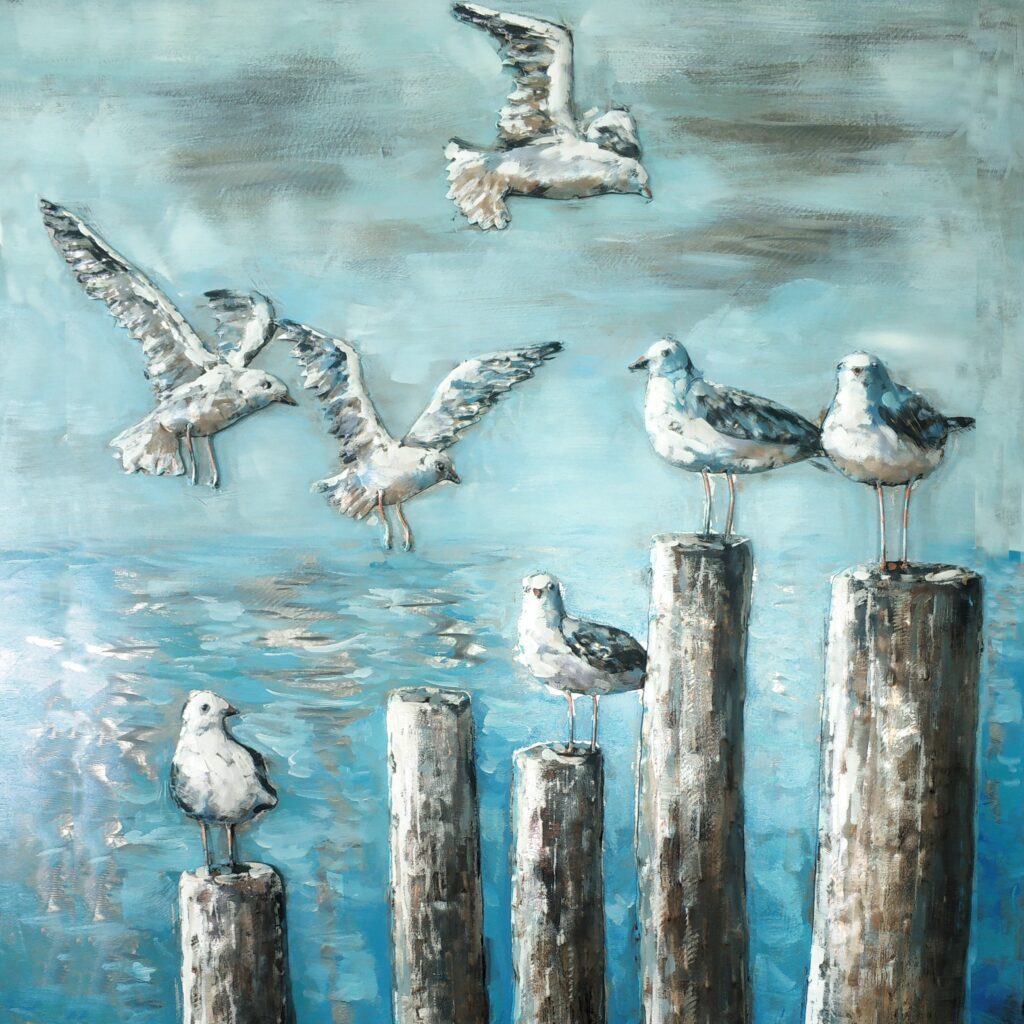 Metalen schilderij “Meeuwen op palen”