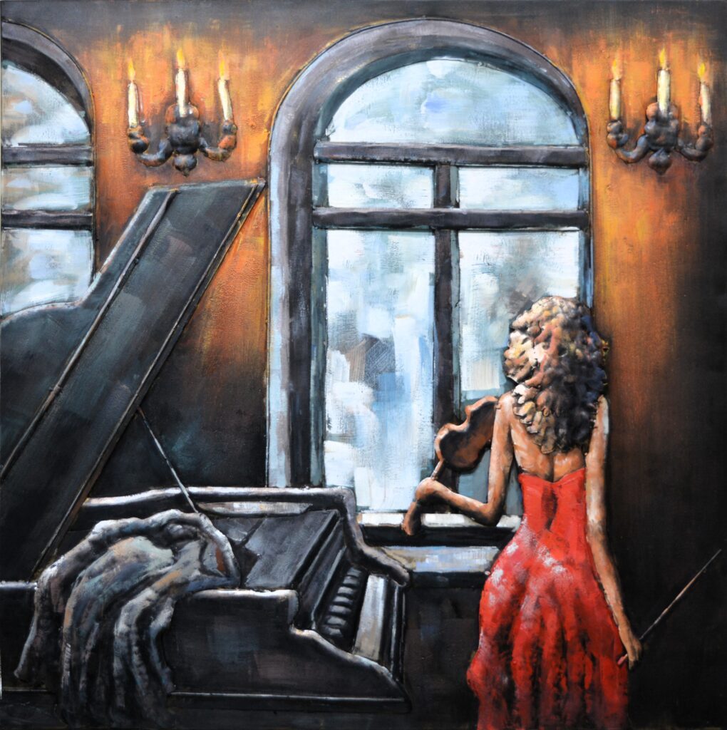 Metalen schilderij “Meisje met viool en piano”