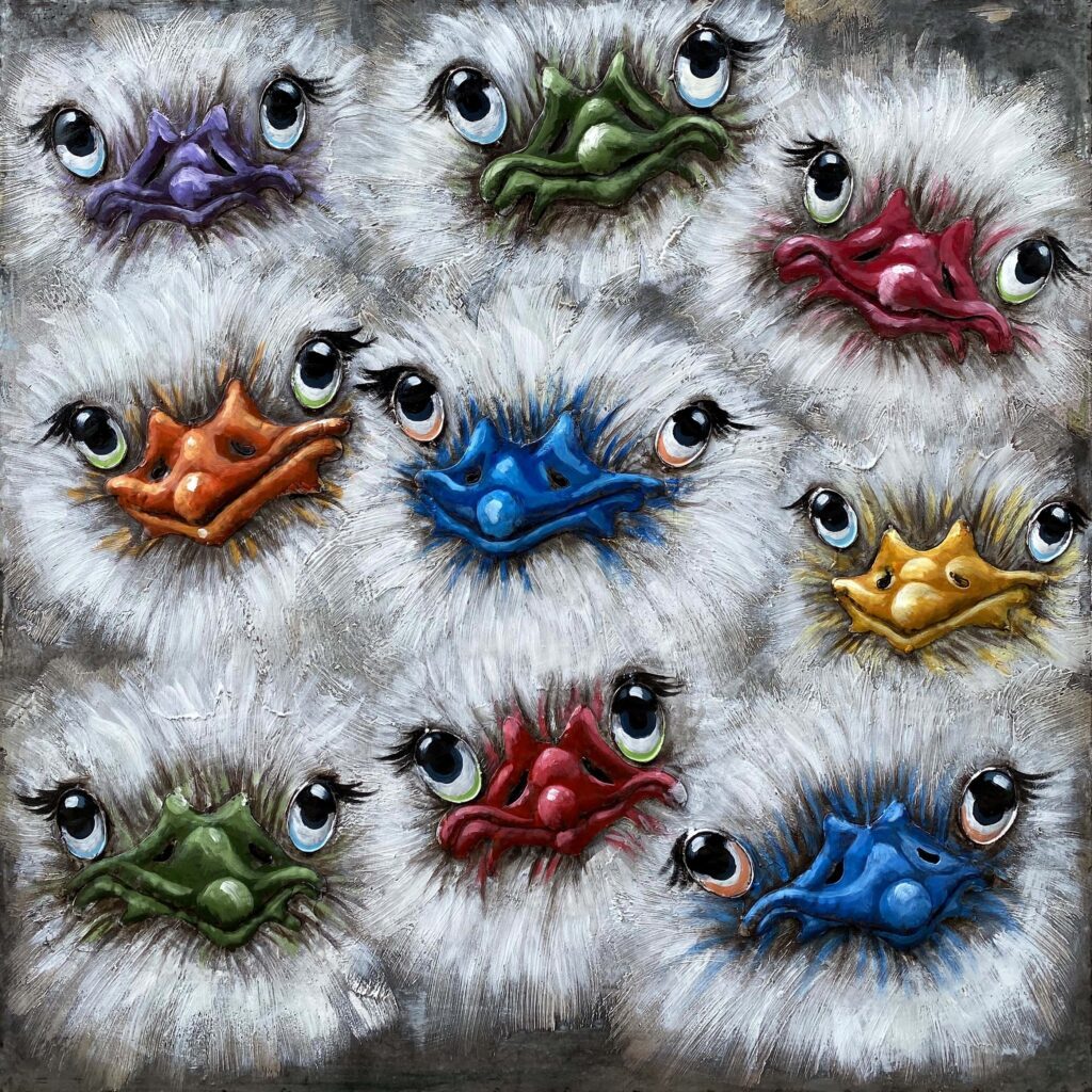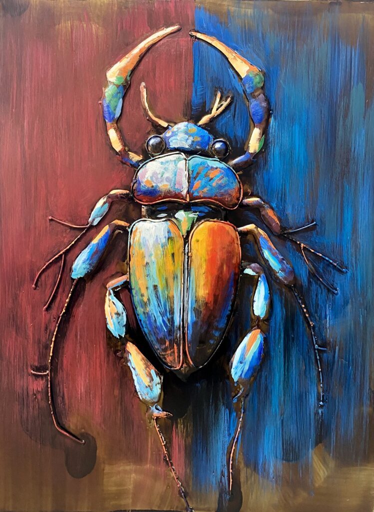Onze kunstwerken van metaal zijn gemaakt van tientallen tot meer dan 100 metalen onderdelen. Deze worden op een geraffineerde wijze aan elkaar gelast en bevestigd totdat de juiste voorstelling is bereikt. Het resultaat is wel altijd een rechthoekig geheel, meestal vierkant 100×100 cm of landscape 120×80 cm en weegt ongeveer 7 kg/m2. De metalen delen worden vervolgens geverfd en voorzien van nog meer losse onderdelen zoals metalen bouten en schroeven om het geheel nog spannender te maken.