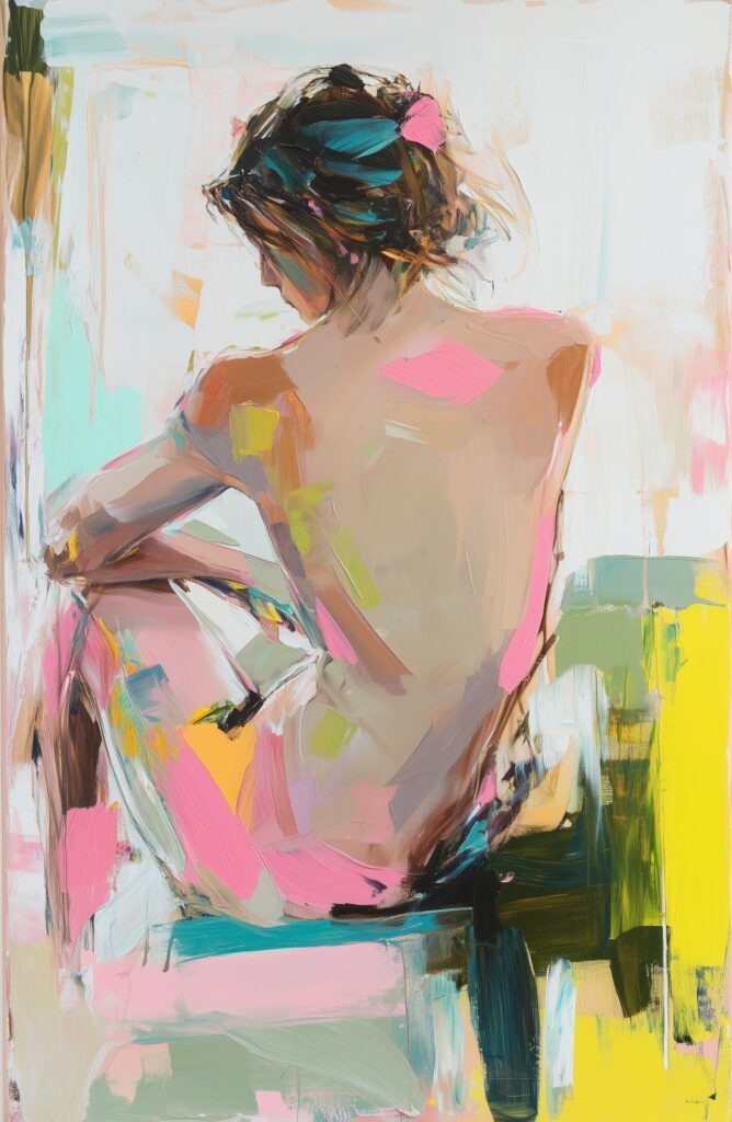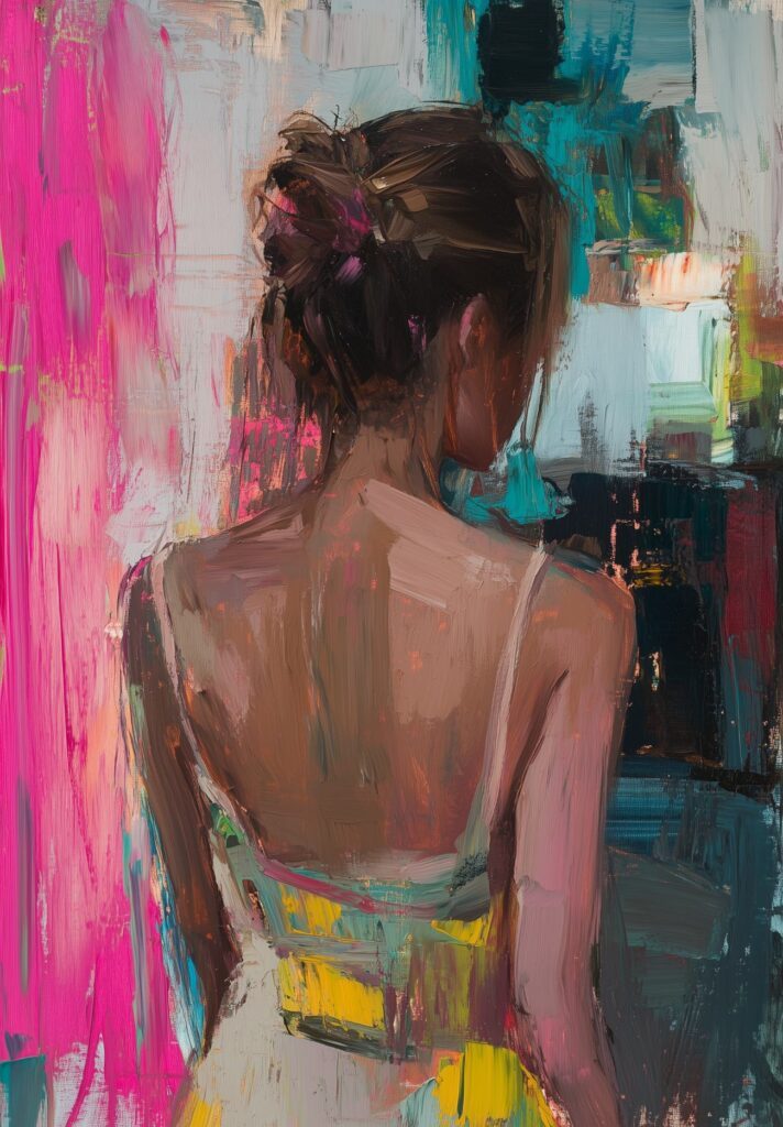 Schilderij achterkant vrouw in jurk abstracte paletmes stijl
