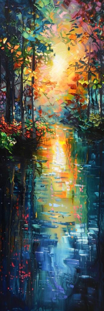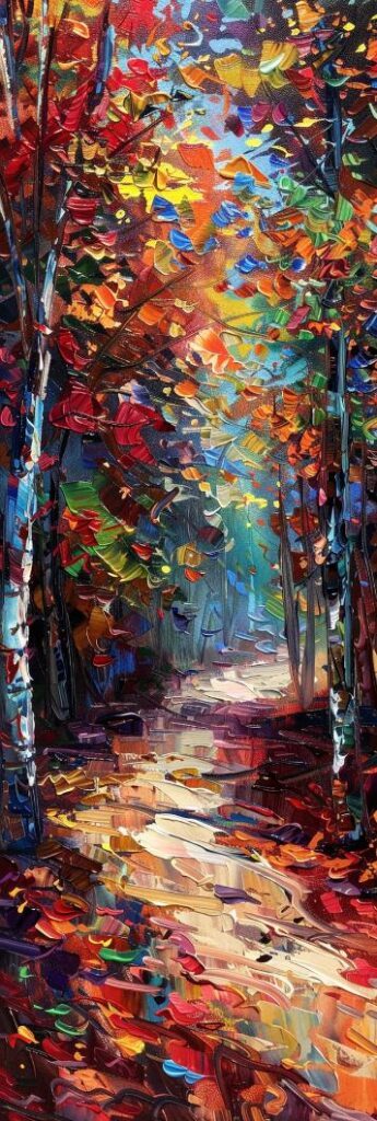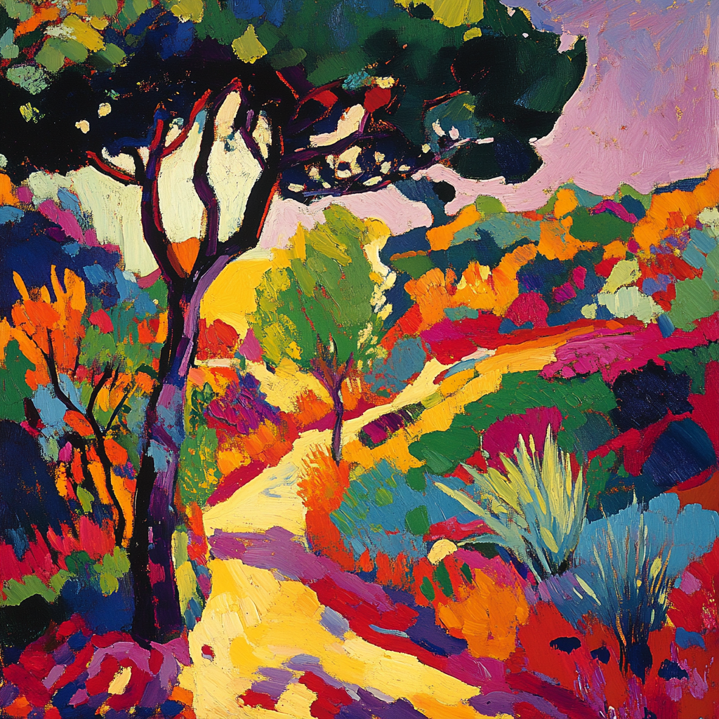 Schilderij kleurrijk bos met lage zon en lange schaduwen fauvism stijl
