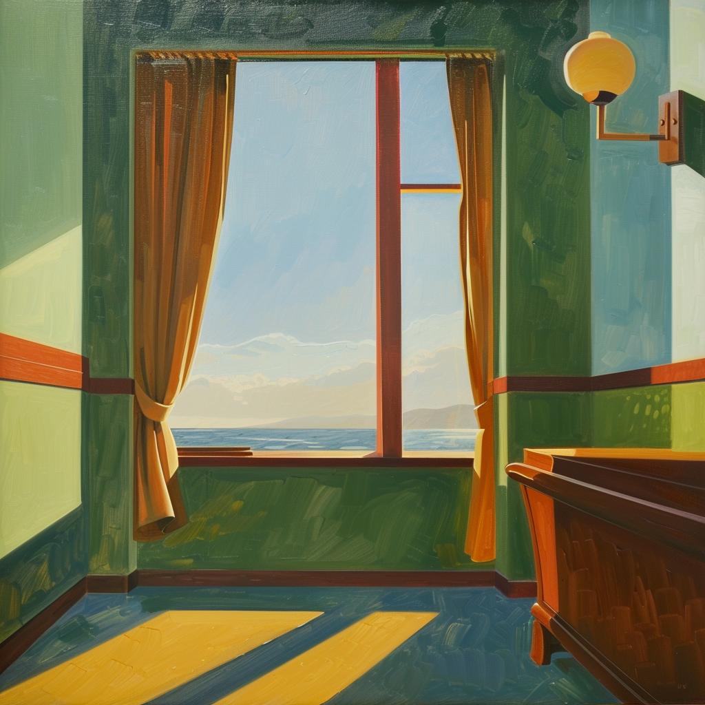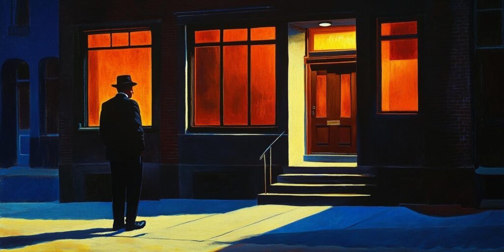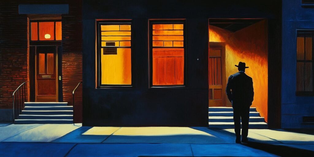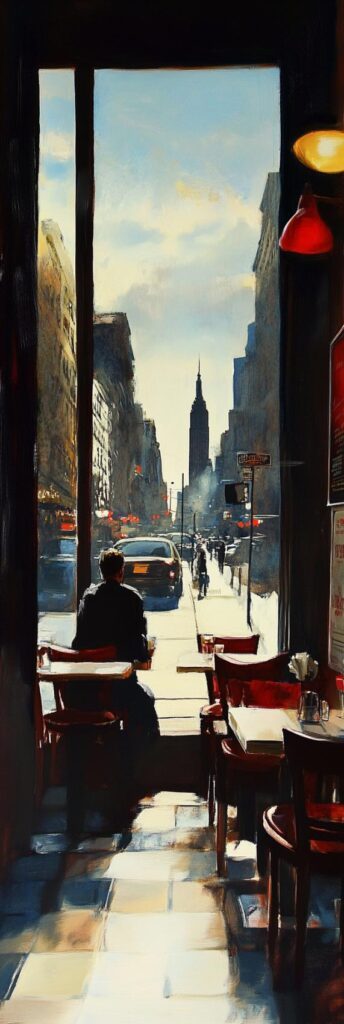 Schilderij cafe doorkijk naar de stad edward hopper stijl