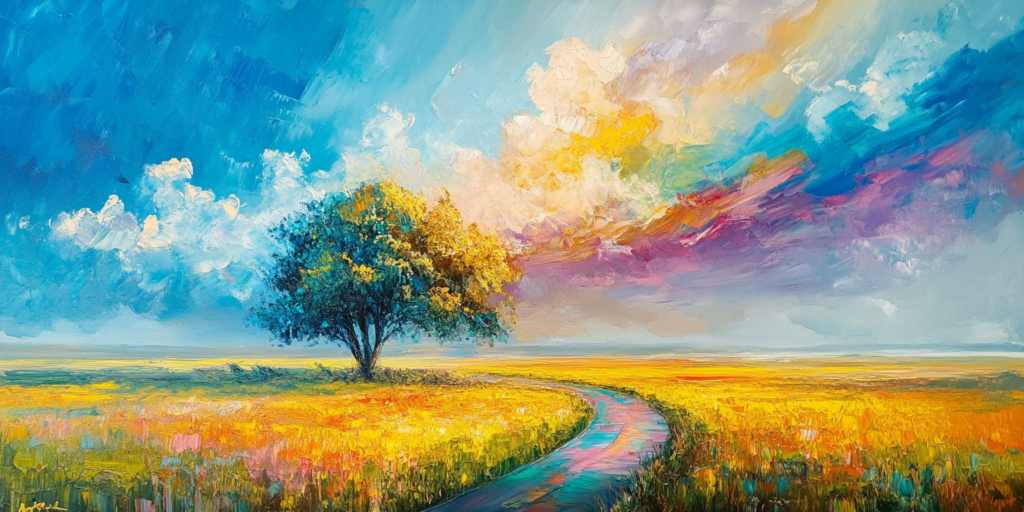 Schilderij kleurrijke lucht boven graslandschap met rivier impressionistische stijl