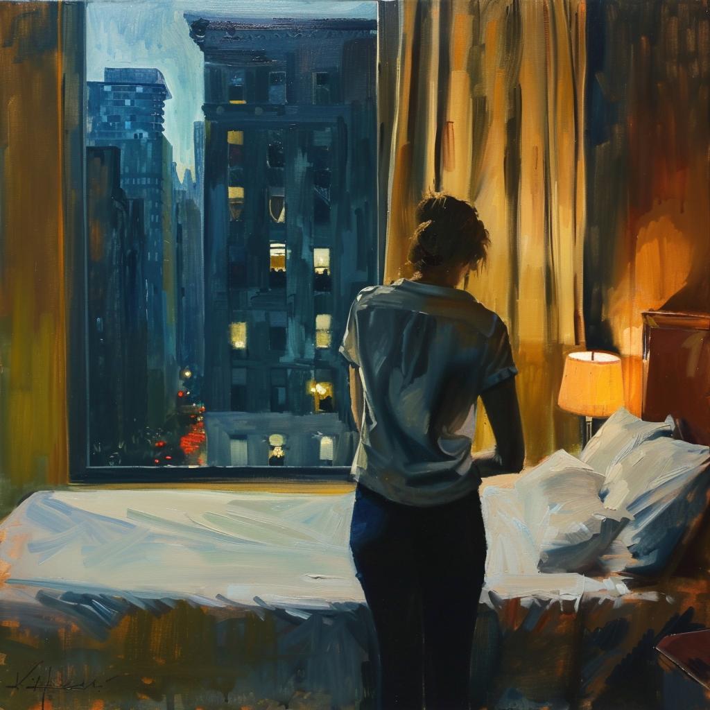Schilderij hotelkamer met vrouw aan bed edward hopper stijlOlieverf en acryl,Schilderijen€149,00 - €499,00Prijsklasse: €149,00 tot €499,00