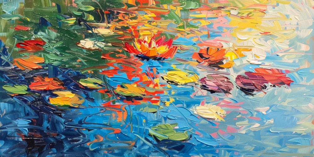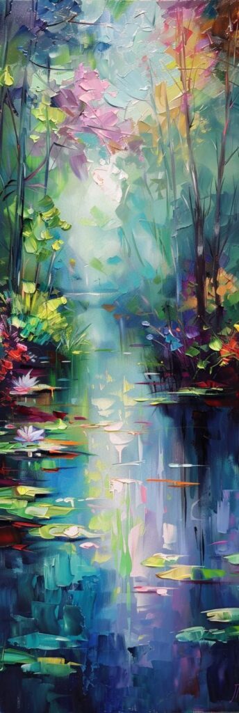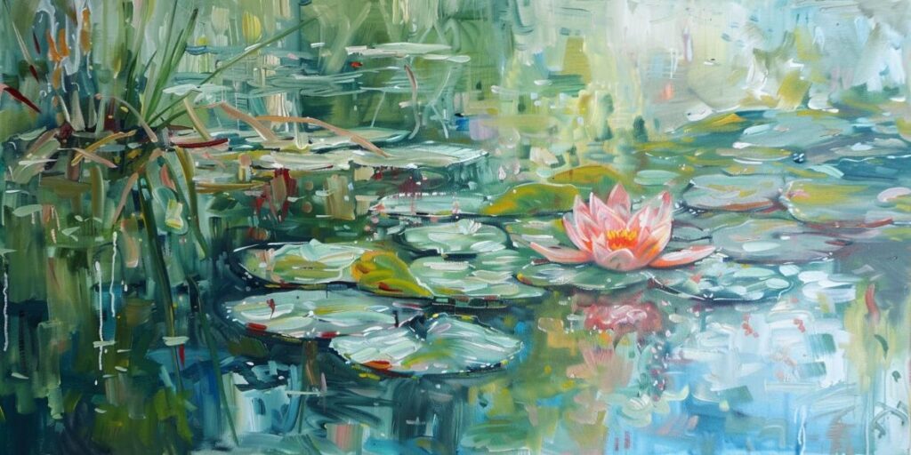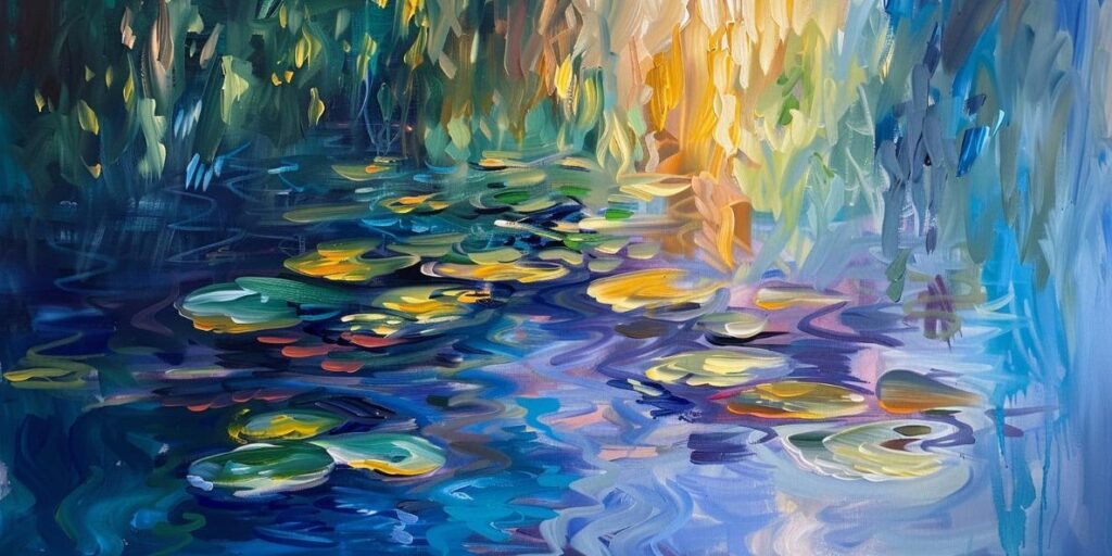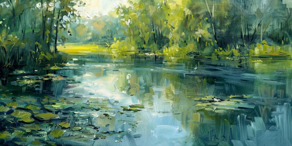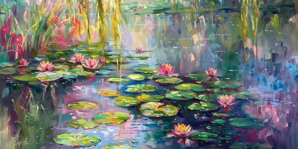 Schilderij slootje met lelies en bomen impressionistische stijl