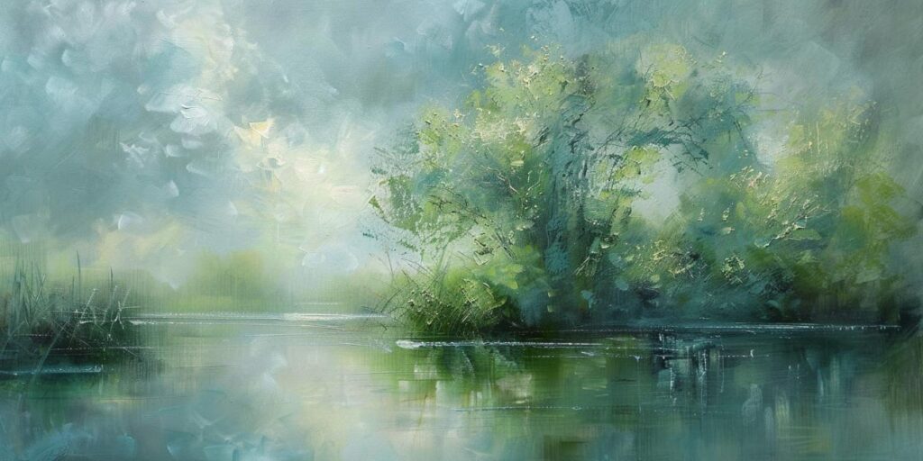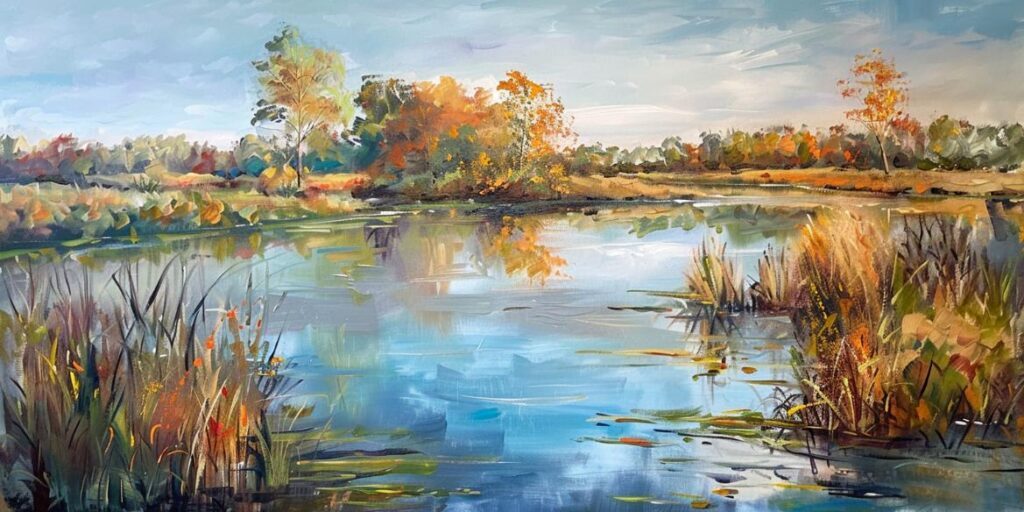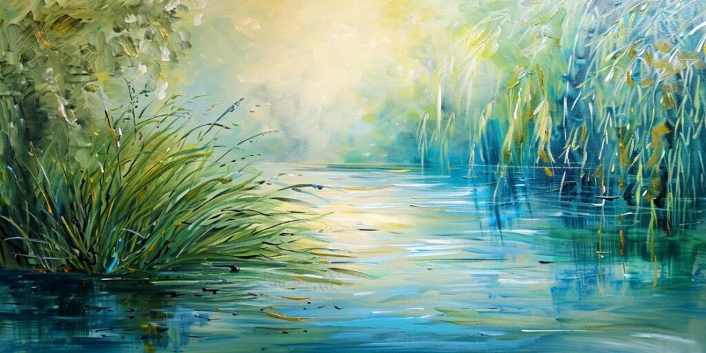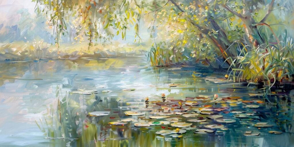 Schilderij waterlelies en riet in de sloot impressionistische stijl